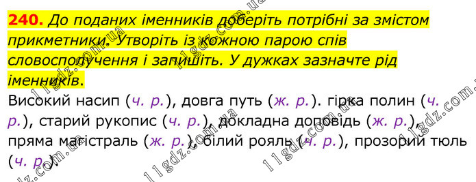 До поданих іменників доберіть потрібні за змістом прикметники. Утворіть із кожною парою спів словосполучення і запишіть. У дужках зазначте рід іменників. Високий насип (ч. р.), довга путь (ж. р.). гірка полин (ч. р.), старий рукопис (ч. р.), докладна доповідь (ж. р.), пряма магістраль (ж. р.), білий рояль (ч. р.), прозорий тюль (ч. р.).