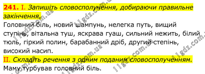 І. Запишіть словосполучення, добираючи правильне закінчення. Головний біль, новий шампунь, нелегка путь, вищий ступінь, вітальна туш, яскрава гуаш, сильний нежить, білий тюль, гіркий полин, барабанний дріб, другий степінь, високий насип. II. Складіть речення з одним поданим словосполученням. Маму турбував головний біль.