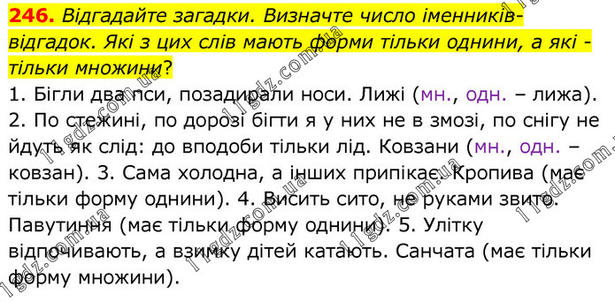 Відгадайте загадки. Визначте число іменників-відгадок. Які з цих слів мають форми тільки однини, а які - тільки множини? 1. Бігли два пси, позадирали носи. Лижі (мн., одн. – лижа). 2. По стежині, по дорозі бігти я у них не в змозі, по снігу не йдуть як слід: до вподоби тільки лід. Ковзани (мн., одн. – ковзан). 3. Сама холодна, а інших припікає. Кропива (має тільки форму однини). 4. Висить сито, не руками звито. Павутиння (має тільки форму однини). 5. Улітку відпочивають, а взимку дітей катають. Санчата (має тільки форму множини).