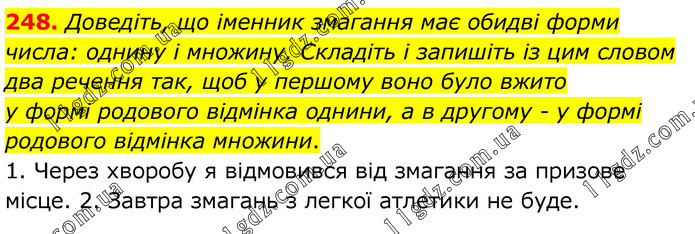 Доведіть, що іменник змагання має обидві форми числа: однину і множину. Складіть і запишіть із цим словом два речення так, щоб у першому воно було вжито у формі родового відмінка однини, а в другому - у формі родового відмінка множини. 1. Через хворобу я відмовився від змагання за призове місце. 2. Завтра змагань з легкої атлетики не буде.