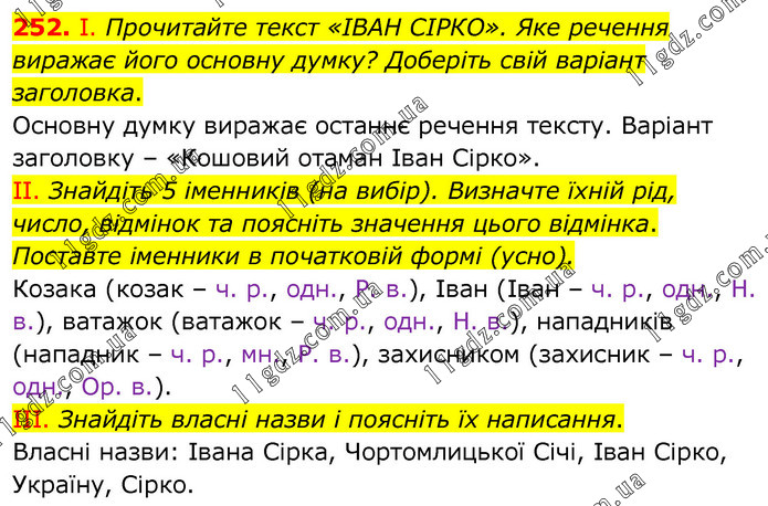 І. Прочитайте текст «ІВАН СІРКО». Яке речення виражає його основну думку? Доберіть свій варіант заголовка. Основну думку виражає останнє речення тексту. Варіант заголовку – «Кошовий отаман Іван Сірко». ІІ. Знайдіть 5 іменників (на вибір). Визначте їхній рід, число, відмінок та поясніть значення цього відмінка. Поставте іменники в початковій формі (усно). Козака (козак – ч. р., одн., Р. в.), Іван (Іван – ч. р., одн., Н. в.), ватажок (ватажок – ч. р., одн., Н. в.), нападників (нападник – ч. р., мн., Р. в.), захисником (захисник – ч. р., одн., Ор. в.). ІІІ. Знайдіть власні назви і поясніть їх написання. Власні назви: Івана Сірка, Чортомлицької Січі, Іван Сірко, Україну, Сірко.