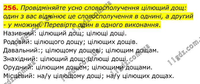 Провідміняйте усно словосполучення цілющий дощ: один з вас відмінює це словосполучення в однині, а другий - у множині. Перевірте один в одного виконання. Називний: цілющий дощ; цілющі дощі. Родовий: цілющого дощу; цілющих дощів. Давальний:; цілющому дощеві; цілющим дощам. Знахідний: цілющий дощ; цілющі дощі. Орудний: цілющим дощем; цілющими дощами. Місцевий: на/у цілющому дощі; на/у цілющих дощах.