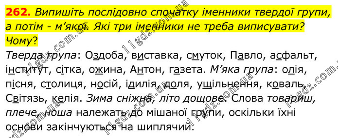 Випишіть послідовно спочатку іменники твердої групи, а потім - м’якої. Які три іменники не треба виписувати? Чому? Тверда група: Оздоба, виставка, смуток, Павло, асфальт, інститут, сітка, ожина, Антон, газета. М’яка група: олія, пісня, столиця, носій, ідилія, доля, ущільнення, коваль, Світязь, келія. Зима сніжна, літо дощове. Слова товариш, плече, ноша належать до мішаної групи, оскільки їхні основи закінчуються на шиплячий.