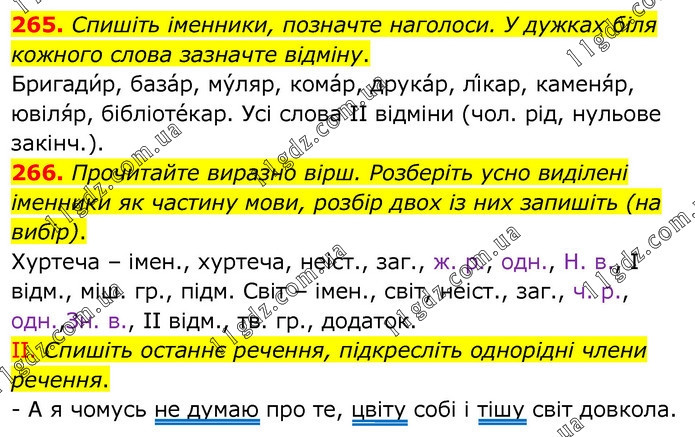 265. Спишіть іменники, позначте наголоси. У дужках біля кожного слова зазначте відміну. Бригади́р, база́р, му́ляр, кома́р, друка́р, лі́кар, каменя́р, ювіля́р, бібліоте́кар. Усі слова ІІ відміни (чол. рід, нульове закінч.). 266. Прочитайте виразно вірш. Розберіть усно виділені іменники як частину мови, розбір двох із них запишіть (на вибір). Хуртеча – імен., хуртеча, неіст., заг., ж. р., одн., Н. в., І відм., міш. гр., підм. Світ – імен., світ, неіст., заг., ч. р., одн.,Зн. в., ІІ відм., тв. гр., додаток. ІІ. Спишіть останнє речення, підкресліть однорідні члени речення. - А я чомусь не думаю про те, цвіту собі і тішу світ довкола.