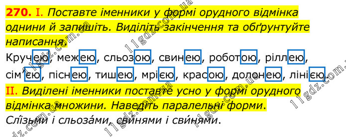 І. Поставте іменники у формі орудного відмінка однини й запишіть. Виділіть закінчення та обґрунтуйте написання. Кручею, межею, сльозою, свинею, роботою, ріллею, сім’єю, піснею, тишею, мрією, красою, долонею, лінією. ІІ. Виділені іменники поставте усно у формі орудного відмінка множини. Наведіть паралельні форми. Слі́зьми і сльоза́ми, сви́нями і сви́нями.