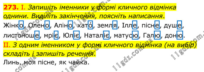 І. Запишіть іменники у формі кличного відмінка однини. Виділіть закінчення, поясніть написання. Жінко, Олено, Аліно, хато́, земля, Ілле, пісне, душе, листоноше, мріє, Юліє, Наталіє, матусю, Галю, доню. ІІ. З одним іменником у формі кличного відмінка (на вибір) складіть і запишіть речення. Линь, моя пісне, як чайка.