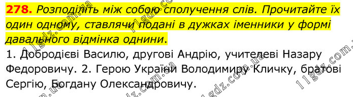 Розподіліть між собою сполучення слів. Прочитайте їх один одному, ставлячи подані в дужках іменники у формі давального відмінка однини. 1. Добродієві Василю, другові Андрію, учителеві Назару Федоровичу. 2. Герою України Володимиру Кличку, братові Сергію, Богдану Олександровичу.