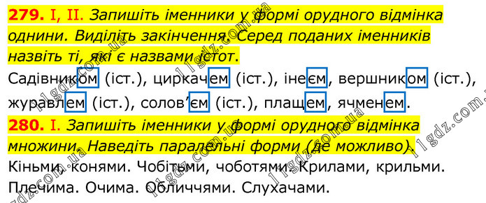 279. І, ІІ. Запишіть іменники у формі орудного відмінка однини. Виділіть закінчення. Серед поданих іменників назвіть ті, які є назвами істот. Садівником (іст.), циркачем (іст.), інеєм, вершником (іст.), журавлем (іст.), солов’єм (іст.), плащем, ячменем. 280. І. Запишіть іменники у формі орудного відмінка множини. Наведіть паралельні форми (де можливо). Кіньми, конями. Чобітьми, чоботями. Крилами, крильми. Плечима. Очима. Обличчями. Слухачами.