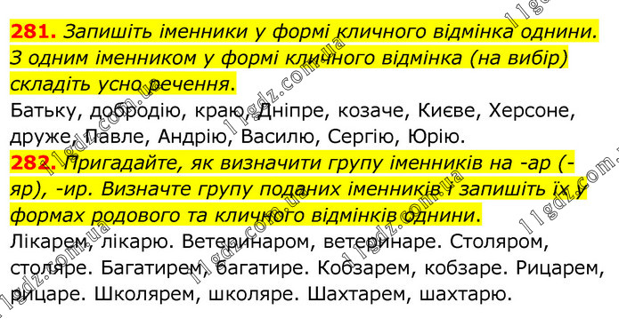 281. Запишіть іменники у формі кличного відмінка однини. З одним іменником у формі кличного відмінка (на вибір) складіть усно речення. Батьку, добродію, краю, Дніпре, козаче, Києве, Херсоне, друже, Павле, Андрію, Василю, Сергію, Юрію. 282. Пригадайте, як визначити групу іменників на -ар (-яр), -ир. Визначте групу поданих іменників і запишіть їх у формах родового та кличного відмінків однини. Лікарем, лікарю. Ветеринаром, ветеринаре. Столяром, столяре. Багатирем, багатире. Кобзарем, кобзаре. Рицарем, рицаре. Школярем, школяре. Шахтарем, шахтарю.