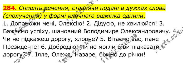 Спишіть речення, ставлячи подані в дужках слова (сполучення) у формі кличного відмінка однини. 1. Допоможи мені, Олексію! 2. Дідусю, не хвилюйся! 3. Бажаємо успіху, шановний Володимире Олександровичу. 4. Чи не підкажеш дорогу, хлопче? 5. Вітаємо вас, пане Президенте! 6. Добродію! Чи не могли б ви підказати дорогу? 7. Ілле, Олеже, Назаре, біжімо до річки!