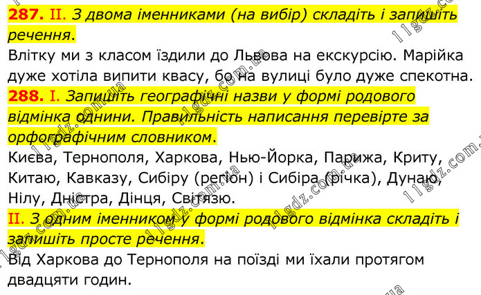 287. ІІ. З двома іменниками (на вибір) складіть і запишіть речення. Влітку ми з класом їздили до Львова на екскурсію. Марійка дуже хотіла випити квасу, бо на вулиці було дуже спекотна. 288. І. Запишіть географічні назви у формі родового відмінка однини. Правильність написання перевірте за орфографічним словником. Києва, Тернополя, Харкова, Нью-Йорка, Парижа, Криту, Китаю, Кавказу, Сибіру (регіон) і Сибіра (річка), Дунаю, Нілу, Дністра, Дінця, Світязю. ІІ. З одним іменником у формі родового відмінка складіть і запишіть просте речення. Від Харкова до Тернополя на поїзді ми їхали протягом двадцяти годин.