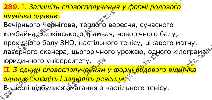 І. Запишіть словосполучення у формі родового відмінка однини. Вечірнього Чернігова, теплого вересня, сучасного комбайна, харківського трамвая, новорічного балу, прохідного балу ЗНО, настільного тенісу, цікавого матчу, лазерного сканера, цьогорічного урожаю, одного кілограма, юридичного університету. ІІ. З одним словосполученням у формі родового відмінка однини складіть і запишіть речення. В школі відбулися змагання з настільного тенісу.