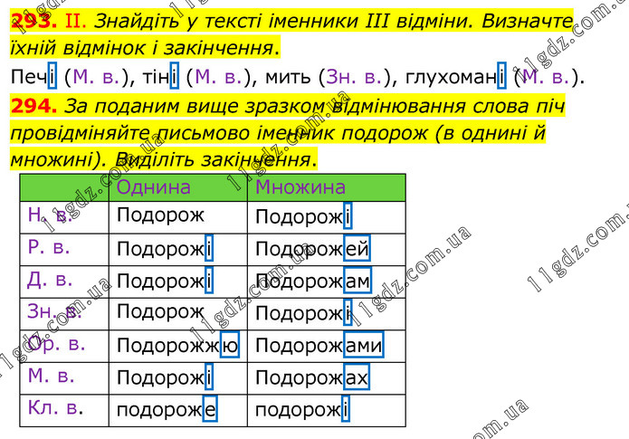 293. ІІ. Знайдіть у тексті іменники III відміни. Визначте їхній відмінок і закінчення. Печі (М. в.), тіні (М. в.), мить (Зн. в.), глухомані (М. в.). 294. За поданим вище зразком відмінювання слова піч провідміняйте письмово іменник подорож (в однині й множині). Виділіть закінчення. Однина Множина Н. в. Подорож Подорожі Р. в. Подорожі Подорожей Д. в. Подорожі Подорожам Зн. в. Подорож Подорожі Ор. в. Подорожжю Подорожами М. в. Подорожі Подорожах Кл. в. подороже подорожі