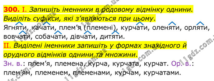 І. Запишіть іменники в родовому відмінку однини. Виділіть суфікси, які з’являються при цьому. Ягняти, качати, плем’я (племені), курчати, оленяти, орляти, вовчати, собачати, дівчати, дитяти. ІІ. Виділені іменники запишіть у формах знахідного й орудного відмінків однини та множини. Зн. в.: плем’я, племена, курча, курчата, курчат. Ор. в.: плем’ям, племенем, племенами, курчам, курчатами.