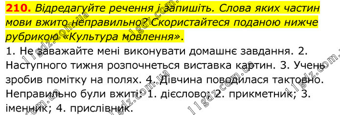 Відредагуйте речення і запишіть. Слова яких частин мови вжито неправильно? Скористайтеся поданою нижче рубрикою «Культура мовлення». 1. Не заважайте мені виконувати домашнє завдання. 2. Наступного тижня розпочнеться виставка картин. 3. Учень зробив помітку на полях. 4. Дівчина поводилася тактовно. Неправильно були вжиті: 1. дієслово; 2. прикметник; 3. іменник; 4. прислівник.