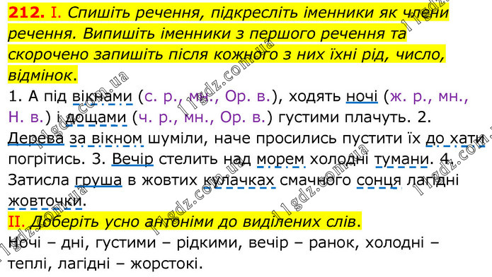І. Спишіть речення, підкресліть іменники як члени речення. Випишіть іменники з першого речення та скорочено запишіть після кожного з них їхні рід, число, відмінок. 1. А під вікнами (с. р., мн., Ор. в.), ходять ночі (ж. р., мн., Н. в.) і дощами (ч. р., мн., Ор. в.) густими плачуть. 2. Дерева за вікном шуміли, наче просились пустити їх до хати погрітись. 3. Вечір стелить над морем холодні тумани. 4. Затисла груша в жовтих кулачках смачного сонця лагідні жовточки. ІІ. Доберіть усно антоніми до виділених слів. Ночі – дні, густими – рідкими, вечір – ранок, холодні – теплі, лагідні – жорстокі.
