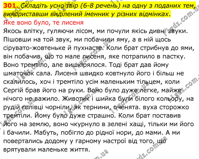Складіть усно твір (6-8 речень) на одну з поданих тем, використавши виділений іменник у різних відмінках. Яке воно було, те лисеня Якось влітку, гуляючи лісом, ми почули якісь дивні звуки. Пішовши на той звук, ми побачили яму, а в ній щось сірувато-жовтеньке й пухнасте. Коли брат стрибнув до ями, він побачив, що то мале лисеня, яке потрапило в пастку. Воно тремтіло, але вишкірялося. Тоді брат дав йому шматочок сала. Лисеня швидко ковтнуло його і більш не скалилось, хоч і тремтіло усім маленьким тільцем, коли Сергій брав його на руки. Воно було дуже легке, майже нічого не важило. Животик і шийка були білого кольору, на рудій голівці чорніли, як тернини, оченята. вуха сторожко тремтіли. Йому було дуже страшно. Коли брат поставив його на землю, воно чкурнуло в зелені хащі, тільки ми його і бачили. Мабуть, побігло до рідної нори, до мами. А ми повертались додому у гарному настрої від того, що врятували маленьке життя.
