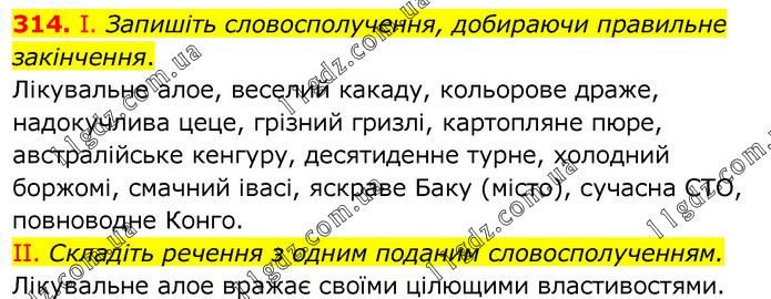 І. Запишіть словосполучення, добираючи правильне закінчення. Лікувальне алое, веселий какаду, кольорове драже, надокучлива цеце, грізний гризлі, картопляне пюре, австралійське кенгуру, десятиденне турне, холодний боржомі, смачний івасі, яскраве Баку (місто), сучасна СТО, повноводне Конго. II. Складіть речення з одним поданим словосполученням. Лікувальне алое вражає своїми цілющими властивостями.