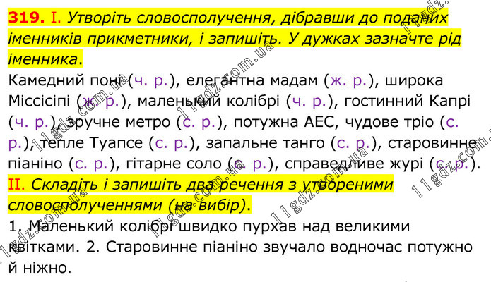 І. Утворіть словосполучення, дібравши до поданих іменників прикметники, і запишіть. У дужках зазначте рід іменника. Камедний поні (ч. р.), елегантна мадам (ж. р.), широка Міссісіпі (ж. р.), маленький колібрі (ч. р.), гостинний Капрі (ч. р.), зручне метро (с. р.), потужна АЕС, чудове тріо (с. р.), тепле Туапсе (с. р.), запальне танго (с. р.), старовинне піаніно (с. р.), гітарне соло (с. р.), справедливе журі (с. р.). ІІ. Складіть і запишіть два речення з утвореними словосполученнями (на вибір). 1. Маленький колібрі швидко пурхав над великими квітками. 2. Старовинне піаніно звучало водночас потужно й ніжно.