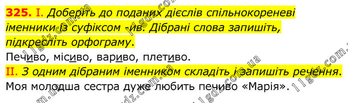І. Доберіть до поданих дієслів спільнокореневі іменники із суфіксом -ив. Дібрані слова запишіть, підкресліть орфограму. Печиво, місиво, вариво, плетиво. ІІ. З одним дібраним іменником складіть і запишіть речення. Моя молодша сестра дуже любить печиво «Марія».