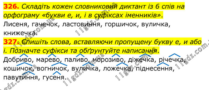 326. Складіть кожен словниковий диктант із 6 спів на орфограму «букви е, и, і в суфіксах іменників». Лисеня, гачечок, ластовиння, горшичок, вуличка, книжечка. 327. Спишіть слова, вставляючи пропущену букву е, и або і. Позначте суфікси та обґрунтуйте написання. Добриво, марево, паливо, морозиво, діжечка, річечка, кошичок, вогничок, вуличка, ложечка, піднесення, павутиння, гусеня.