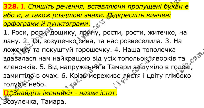 І. Спишіть речення, вставляючи пропущені букви е або и, а також розділові знаки. Підкресліть вивчені орфограми й пунктограми. 1. Роси, роси, дощику, ярину, рости, рости, житечко, на лану. 2. Ти, зозулечко сива, та нас розвеселила. 3. На ложечку та покуштуй горошечку. 4. Наша тополечка здавалася нам найкращою від усіх топольок, яворків та кленочків. 5. Від напруження в Тамари зашуміло в голові, замигтіло в очах. 6. Крізь мереживо листя і цвіту глибоко голубіє небо. ІІ. Знайдіть іменники - назви істот. Зозулечка, Тамара.