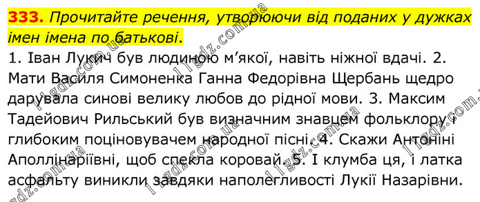 Прочитайте речення, утворюючи від поданих у дужках імен імена по батькові. 1. Іван Лукич був людиною м’якої, навіть ніжної вдачі. 2. Мати Василя Симоненка Ганна Федорівна Щербань щедро дарувала синові велику любов до рідної мови. 3. Максим Тадейович Рильський був визначним знавцем фольклору і глибоким поціновувачем народної пісні. 4. Скажи Антоніні Аполлінаріївні, щоб спекла коровай. 5. І клумба ця, і латка асфальту виникли завдяки наполегливості Лукії Назарівни.