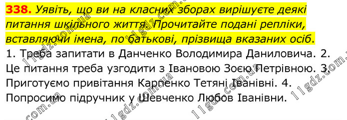 Уявіть, що ви на класних зборах вирішуєте деякі питання шкільного життя. Прочитайте подані репліки, вставляючи імена, по батькові, прізвища вказаних осіб. 1. Треба запитати в Данченко Володимира Даниловича. 2. Це питання треба узгодити з Івановою Зоєю Петрівною. 3. Приготуємо привітання Карпенко Тетяні Іванівні. 4. Попросимо підручник у Шевченко Любов Іванівни.