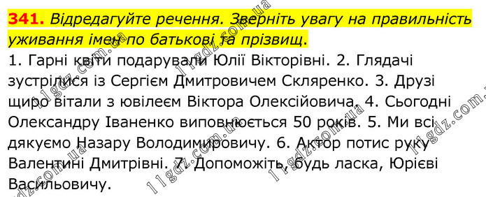 Відредагуйте речення. Зверніть увагу на правильність уживання імен по батькові та прізвищ. 1. Гарні квіти подарували Юлії Вікторівні. 2. Глядачі зустрілися із Сергієм Дмитровичем Скляренко. 3. Друзі щиро вітали з ювілеєм Віктора Олексійовича. 4. Сьогодні Олександру Іваненко виповнюється 50 років. 5. Ми всі дякуємо Назару Володимировичу. 6. Актор потис руку Валентині Дмитрівні. 7. Допоможіть, будь ласка, Юрієві Васильовичу.