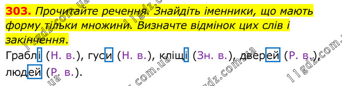 Прочитайте речення. Знайдіть іменники, що мають форму тільки множини. Визначте відмінок цих слів і закінчення. Граблі (Н. в.), гуси (Н. в.), кліщі (Зн. в.), дверей (Р. в.), людей (Р. в.).
