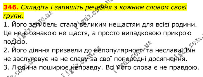 Складіть і запишіть речення з кожним словом своєї групи. 1. Його загибель стала великим нещастям для всієї родини. Це не є ознакою не щастя, а просто випадковою прикрою подією. 2. Його діяння призвели до непопулярності та неслави. Він не заслуговує на не славу за свої попередні досягнення. 3. Людина поширює неправду. Всі його слова є не правдою.