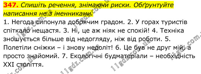 Спишіть речення, знімаючи риски. Обґрунтуйте написання не з іменниками. 1. Негода сипонула добрячим градом. 2. У горах туристів спіткало нещастя. 3. Ні, це аж ніяк не спокій! 4. Техніка зношується більше від недогляду, ніж від роботи. 5. Полетіли сніжки – і знову недоліт! 6. Це був не друг мій, а просто знайомий. 7. Екологічні будматеріали – необхідність XXI століття.