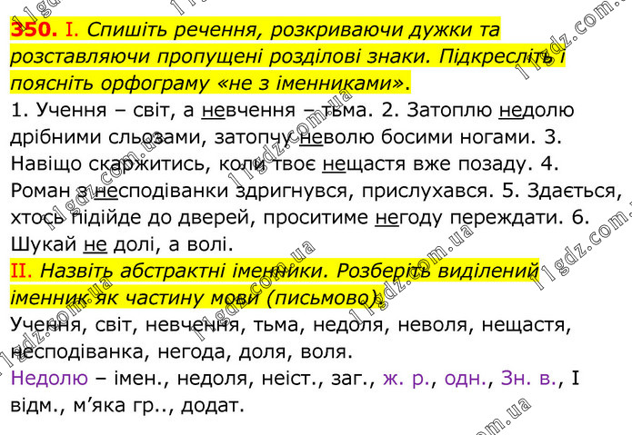 І. Спишіть речення, розкриваючи дужки та розставляючи пропущені розділові знаки. Підкресліть і поясніть орфограму «не з іменниками». 1. Учення – світ, а невчення – тьма. 2. Затоплю недолю дрібними сльозами, затопчу неволю босими ногами. 3. Навіщо скаржитись, коли твоє нещастя вже позаду. 4. Роман з несподіванки здригнувся, прислухався. 5. Здається, хтось підійде до дверей, проситиме негоду переждати. 6. Шукай не долі, а волі. ІІ. Назвіть абстрактні іменники. Розберіть виділений іменник як частину мови (письмово). Учення, світ, невчення, тьма, недоля, неволя, нещастя, несподіванка, негода, доля, воля. Недолю – імен., недоля, неіст., заг., ж. р., одн., Зн. в., І відм., м’яка гр.., додат.