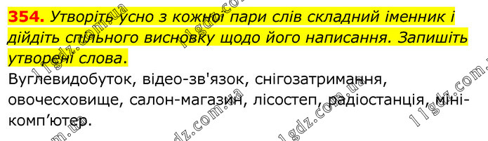 Утворіть усно з кожної пари слів складний іменник і дійдіть спільного висновку щодо його написання. Запишіть утворені слова. Вуглевидобуток, відео-зв'язок, снігозатримання, овочесховище, салон-магазин, лісостеп, радіостанція, міні-комп’ютер.