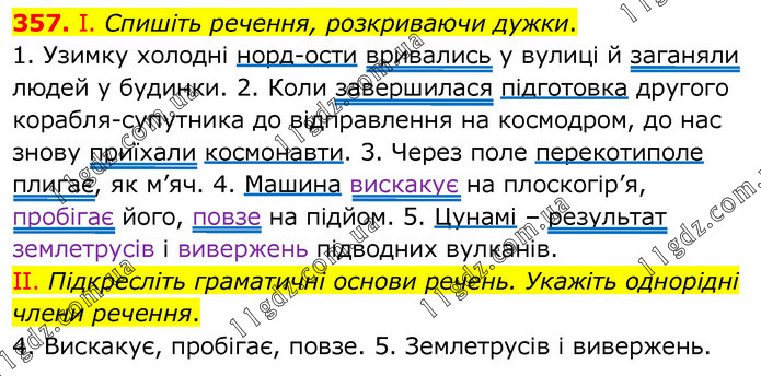 І. Спишіть речення, розкриваючи дужки. 1. Узимку холодні норд-ости вривались у вулиці й заганяли людей у будинки. 2. Коли завершилася підготовка другого корабля-супутника до відправлення на космодром, до нас знову приїхали космонавти. 3. Через поле перекотиполе плигає, як м’яч. 4. Машина вискакує на плоскогір’я, пробігає його, повзе на підйом. 5. Цунамі – результат землетрусів і вивержень підводних вулканів. ІІ. Підкресліть граматичні основи речень. Укажіть однорідні члени речення. 4. Вискакує, пробігає, повзе. 5. Землетрусів і вивержень.