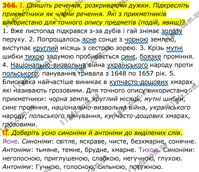 І. Спишіть речення, розкриваючи дужки. Підкресліть прикметники як члени речення. Які з прикметників використано для точного опису предметів (подій, явищ)? 1. Вже листопад підкрався з-за дубів і гай знімає золоту перуку. 2. Попрощалось ясне сонце з чорною землею, виступає круглий місяць з сестрою зорею. 3. Крізь мутні шибки тихою задумою пробивається синє, боязке проміння. 4. Національно-визвольна війна українського народу проти польського, панування тривала з 1648 по 1657 рік. 5. Блискавка найчастіше виникає в купчасто-дощових хмарах, які називають грозовими. Для точного опису використано прикметники: чорна земля, круглий місяць, мутні шибки, синє проміння, національно-визвольна війна, українського народу, польського панування, купчасто-дощових хмарах, грозовими. ІІ. Доберіть усно синоніми й антоніми до виділених слів. Ясне. Синоніми: світле, яскраве, чисте, безхмарне, сонячне. Антоніми: тьмяне, темне, брудне, хмарне. Тихою. Синоніми: неголосною, приглушеною, слабкою, негучною, глухою. Антоніми: Гучною, голосною, сильною, потужною.