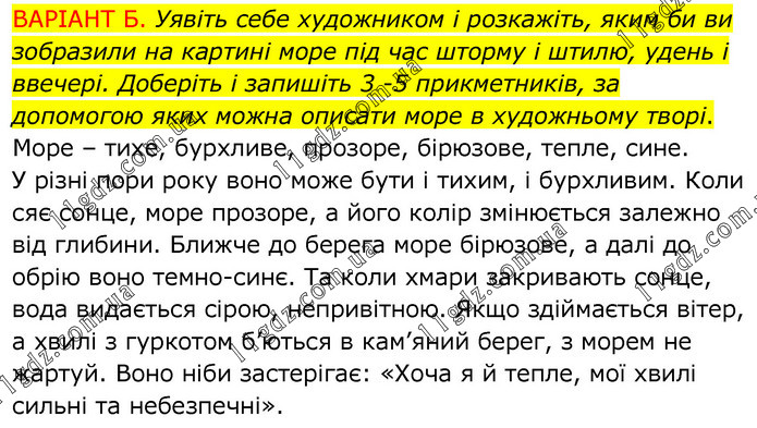 ВАРІАНТ Б. Уявіть себе художником і розкажіть, яким би ви зобразили на картині море під час шторму і штилю, удень і ввечері. Доберіть і запишіть 3 -5 прикметників, за допомогою яких можна описати море в художньому творі. Море – тихе, бурхливе, прозоре, бірюзове, тепле, сине. У різні пори року воно може бути і тихим, і бурхливим. Коли сяє сонце, море прозоре, а його колір змінюється залежно від глибини. Ближче до берега море бірюзове, а далі до обрію воно темно-синє. Та коли хмари закривають сонце, вода видається сірою, непривітною. Якщо здіймається вітер, а хвилі з гуркотом б’ються в кам’яний берег, з морем не жартуй. Воно ніби застерігає: «Хоча я й тепле, мої хвилі сильні та небезпечні».