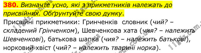 Визначте усно, які з прикметників належать до присвійних. Обґрунтуйте свою думку. Присвійні прикметники: Гринченків словник (чий? – складений Грінченком), Шевченкова хата (чия? – належить Шевченкові), батькова шапка (чия? – належить батькові), норковий хвіст (чий? – належить тварині норка).