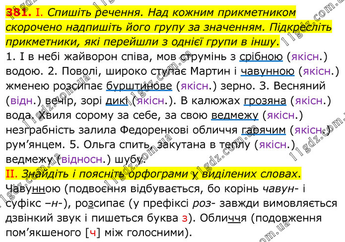 І. Спишіть речення. Над кожним прикметником скорочено надпишіть його групу за значенням. Підкресліть прикметники, які перейшли з однієї групи в іншу. 1. І в небі жайворон співа, мов струмінь з срібною (якісн.) водою. 2. Поволі, широко ступає Мартин і чавунною (якісн.) жменею розсипає бурштинове (якісн.) зерно. З. Весняний (відн.) вечір, зорі дикі (якісн.). В калюжах грозяна (якісн.) вода. Хвиля сорому за себе, за свою ведмежу (якісн.) незграбність залила Федоренкові обличчя гарячим (якісн.) рум’янцем. 5. Ольга спить, закутана в теплу (якісн.) ведмежу (відносн.) шубу. ІІ. Знайдіть і поясніть орфограми у виділених словах. Чавунною (подвоєння відбувається, бо корінь чавун- і суфікс –н-), розсипає (у префіксі роз- завжди вимовляється дзвінкий звук і пишеться буква з). Обличчя (подовження пом’якшеного [ч] між голосними).