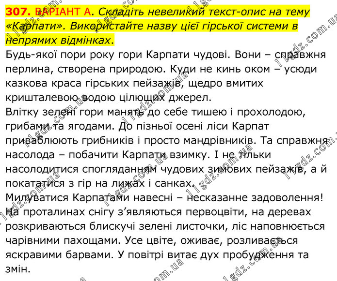 ВАРІАНТ А. Складіть невеликий текст-опис на тему «Карпати». Використайте назву цієї гірської системи в непрямих відмінках. Будь-якої пори року гори Карпати чудові. Вони – справжня перлина, створена природою. Куди не кинь оком – усюди казкова краса гірських пейзажів, щедро вмитих кришталевою водою цілющих джерел. Влітку зелені гори манять до себе тишею і прохолодою, грибами та ягодами. До пізньої осені ліси Карпат приваблюють грибників і просто мандрівників. Та справжня насолода – побачити Карпати взимку. І не тільки насолодитися спогляданням чудових зимових пейзажів, а й покататися з гір на лижах і санках. Милуватися Карпатами навесні – несказанне задоволення! На проталинах снігу з’являються первоцвіти, на деревах розкриваються блискучі зелені листочки, ліс наповнюється чарівними пахощами. Усе цвіте, оживає, розливається яскравими барвами. У повітрі витає дух пробудження та змін.