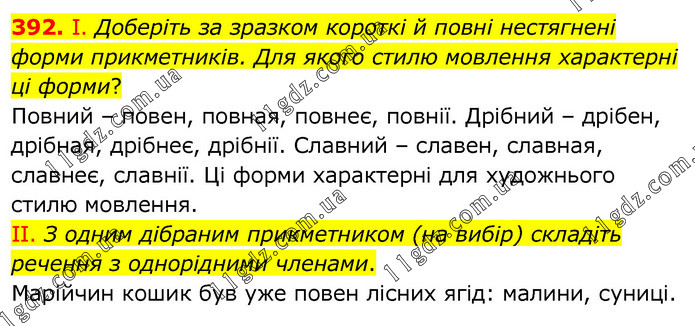 І. Доберіть за зразком короткі й повні нестягнені форми прикметників. Для якого стилю мовлення характерні ці форми? Повний – повен, повная, повнеє, повнії. Дрібний – дрібен, дрібная, дрібнеє, дрібнії. Славний – славен, славная, славнеє, славнії. Ці форми характерні для художнього стилю мовлення. ІІ. З одним дібраним прикметником (на вибір) складіть речення з однорідними членами. Марійчин кошик був уже повен лісних ягід: малини, суниці.