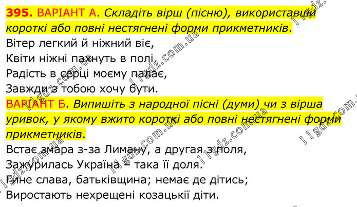 ВАРІАНТ А. Складіть вірш (пісню), використавши короткі або повні нестягнені форми прикметників. Вітер легкий й ніжний віє, Квіти ніжні пахнуть в полі. Радість в серці моєму палає, Завжди з тобою хочу бути. ВАРІАНТ Б. Випишіть з народної пісні (думи) чи з вірша уривок, у якому вжито короткі або повні нестягнені форми прикметників. Встає змара з-за Лиману, а другая з поля, Зажурилась Україна – така її доля. Гине слава, батьківщина; немає де дітись; Виростають нехрещені козацькії діти.