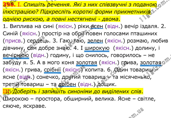 І. Спишіть речення. Які з них співзвучні з поданою ілюстрацією? Підкресліть короткі форми прикметників однією рискою, а повні нестягнені - двома. 1. Виплива на сині (якісн.) ріки ясен (відн.) вечір іздаля. 2. Синій (якісн.) простір на обрії повен голосами пташиних (присв.) сердець. 3. Гаю, гаю, зелен (якісн.) розмаю, любив дівчину, сам добре знаю. 4. І широкую (якісн.) долину, і вечірнюю (відн.) годину, і що снилось, говорилось – не забуду я. 5. А в мого коня золотая (якісн.) грива, золотая (якісн.) грива, срібнії (якісн.) копита. 6. Один товариш – ясне (відн.) сонечко, другий товариш – та місяченько, третій товариш – та дрібен (відн.) дощик. ІІІ. Доберіть і запишіть синоніми до виділених слів. Широкою – простора, обширний, велика. Ясне – світле, сяюче, яскраве.