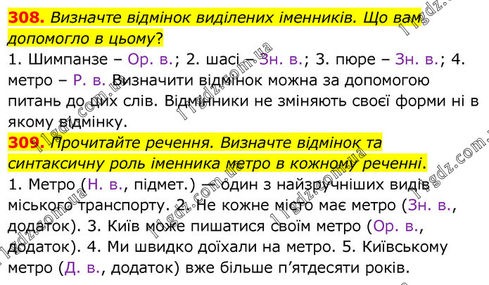 308. Визначте відмінок виділених іменників. Що вам допомогло в цьому? 1. Шимпанзе – Ор. в.; 2. шасі – Зн. в.; 3. пюре – Зн. в.; 4. метро – Р. в. Визначити відмінок можна за допомогою питань до цих слів. Відмінники не зміняють своєї форми ні в якому відмінку. 309. Прочитайте речення. Визначте відмінок та синтаксичну роль іменника метро в кожному реченні. 1. Метро (Н. в., підмет.) — один з найзручніших видів міського транспорту. 2. Не кожне місто має метро (Зн. в., додаток). 3. Київ може пишатися своїм метро (Ор. в., додаток). 4. Ми швидко доїхали на метро. 5. Київському метро (Д. в., додаток) вже більше п’ятдесяти років.