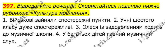 Відредагуйте речення. Скористайтеся поданою нижче рубрикою «Культура мовлення». 1. Військові зайняли спостережні пункти. 2. Учні шостого класу дуже спостережливі. 3. Олеся із задоволенням ходить до музичної школи. 4. У багатьох дітей гарний музичний слух.