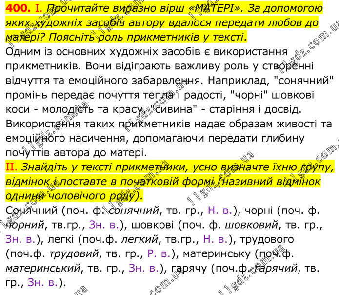 І. Прочитайте виразно вірш «МАТЕРІ». За допомогою яких художніх засобів автору вдалося передати любов до матері? Поясніть роль прикметників у тексті. Одним із основних художніх засобів є використання прикметників. Вони відіграють важливу роль у створенні відчуття та емоційного забарвлення. Наприклад, "сонячний" промінь передає почуття тепла і радості, "чорні" шовкові коси - молодість та красу, "сивина" - старіння і досвід. Використання таких прикметників надає образам живості та емоційного насичення, допомагаючи передати глибину почуттів автора до матері. ІІ. Знайдіть у тексті прикметники, усно визначте їхню групу, відмінок і поставте в початковій формі (називний відмінок однини чоловічого роду). Сонячний (поч. ф. сонячний, тв. гр., Н. в.), чорні (поч. ф. чорний, тв.гр., Зн. в.), шовкові (поч. ф. шовковий, тв. гр., Зн. в.), легкі (поч.ф. легкий, тв.гр., Н. в.), трудового (поч.ф. трудовий, тв. гр., Р. в.), материнську (поч.ф. материнський, тв. гр., Зн. в.), гарячу (поч.ф. гарячий, тв. гр., Зн. в.).