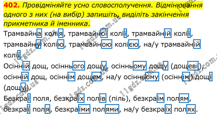 Провідміняйте усно словосполучення. Відмінювання одного з них (на вибір) запишіть, виділіть закінчення прикметника й іменника. Трамвайна колія, трамвайної колії, трамвайній колії, трамвайну колію, трамвайною колією, на/у трамвайній колії. Осінній дощ, осіннього дощу, осінньому дощу (дощеві), осінній дощ, осіннім дощем, на/у осінньому (осіннім) дощі (дощу). Безкраї поля, безкраїх полів (піль), безкраїм полям, безкраї поля, безкраїми полями, на/у безкраїх полях.