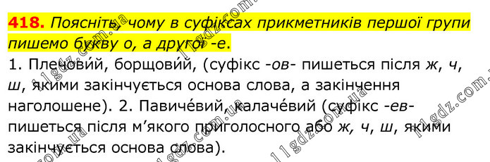 Поясніть, чому в суфіксах прикметників першої групи пишемо букву о, а другої -е. 1. Плечови́й, борщови́й, (суфікс -ов- пишеться після ж, ч, ш, якими закінчується основа слова, а закінчення наголошене). 2. Павиче́вий, калаче́вий (суфікс -ев- пишеться після м’якого приголосного або ж, ч, ш, якими закінчується основа слова).