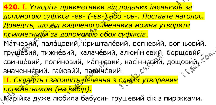 І. Утворіть прикметники від поданих іменників за допомогою суфікса -ев- (-єв-) або -ов-. Поставте наголос. Доведіть, що від виділеного іменника можна утворити прикметники за допомогою обох суфіксів. Ма́тчевий, пала́цовий, криштале́вий, вогневи́й, вогньови́й, груше́вий, тижне́вий, калаче́вий, алюмі́нієвий, борщови́й, свинце́вий, поли́новий, ма́гнієвий, насі́ннєвий, дощови́й, значеннє́вий, гайови́й, павиче́вий. ІІ. Складіть і запишіть речення з одним утвореним прикметником (на вибір). Марійка дуже любила бабусин грушевий сік з пиріжками.