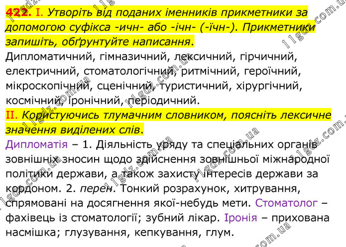 І. Утворіть від поданих іменників прикметники за допомогою суфікса -ичн- або -ічн- (-їчн-). Прикметники запишіть, обґрунтуйте написання. Дипломатичний, гімназичний, лексичний, гірчичний, електричний, стоматологічний, ритмічний, героїчний, мікроскопічний, сценічний, туристичний, хірургічний, космічний, іронічний, періодичний. ІІ. Користуючись тлумачним словником, поясніть лексичне значення виділених слів. Дипломатія – 1. Діяльність уряду та спеціальних органів зовнішніх зносин щодо здійснення зовнішньої міжнародної політики держави, а також захисту інтересів держави за кордоном. 2. перен. Тонкий розрахунок, хитрування, спрямовані на досягнення якої-небудь мети. Стоматолог – фахівець із стоматології; зубний лікар. Іронія – прихована насмішка; глузування, кепкування, глум.